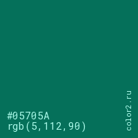 Цвет #05705A в цветовой модели RGB обозначается тремя октетами (5, 112, 90) в десятичном формате и #05705A в шестнадцатиричном (hex) формате, которые являются интенсивностью красного 5 (hex 05), интенсивность зелёного 112 (hex 70) и интенсивность синего 90 (hex 5A).