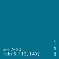 Цвет #05708C в цветовой модели RGB обозначается тремя октетами (5, 112, 140) в десятичном формате и #05708C в шестнадцатиричном (hex) формате, которые являются интенсивностью красного 5 (hex 05), интенсивность зелёного 112 (hex 70) и интенсивность синего 140 (hex 8C).