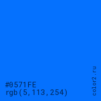 Цвет #0571FE в цветовой модели RGB обозначается тремя октетами (5, 113, 254) в десятичном формате и #0571FE в шестнадцатиричном (hex) формате, которые являются интенсивностью красного 5 (hex 05), интенсивность зелёного 113 (hex 71) и интенсивность синего 254 (hex FE).