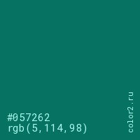 Цвет #057262 в цветовой модели RGB обозначается тремя октетами (5, 114, 98) в десятичном формате и #057262 в шестнадцатиричном (hex) формате, которые являются интенсивностью красного 5 (hex 05), интенсивность зелёного 114 (hex 72) и интенсивность синего 98 (hex 62).