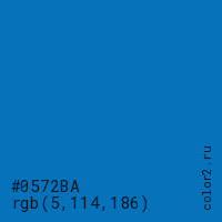 Цвет #0572BA в цветовой модели RGB обозначается тремя октетами (5, 114, 186) в десятичном формате и #0572BA в шестнадцатиричном (hex) формате, которые являются интенсивностью красного 5 (hex 05), интенсивность зелёного 114 (hex 72) и интенсивность синего 186 (hex BA).
