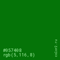 Цвет #057408 в цветовой модели RGB обозначается тремя октетами (5, 116, 8) в десятичном формате и #057408 в шестнадцатиричном (hex) формате, которые являются интенсивностью красного 5 (hex 05), интенсивность зелёного 116 (hex 74) и интенсивность синего 8 (hex 08).