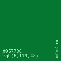 Цвет #057730 в цветовой модели RGB обозначается тремя октетами (5, 119, 48) в десятичном формате и #057730 в шестнадцатиричном (hex) формате, которые являются интенсивностью красного 5 (hex 05), интенсивность зелёного 119 (hex 77) и интенсивность синего 48 (hex 30).