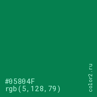 Цвет #05804F в цветовой модели RGB обозначается тремя октетами (5, 128, 79) в десятичном формате и #05804F в шестнадцатиричном (hex) формате, которые являются интенсивностью красного 5 (hex 05), интенсивность зелёного 128 (hex 80) и интенсивность синего 79 (hex 4F).