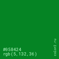 Цвет #058424 в цветовой модели RGB обозначается тремя октетами (5, 132, 36) в десятичном формате и #058424 в шестнадцатиричном (hex) формате, которые являются интенсивностью красного 5 (hex 05), интенсивность зелёного 132 (hex 84) и интенсивность синего 36 (hex 24).