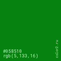 Цвет #058510 в цветовой модели RGB обозначается тремя октетами (5, 133, 16) в десятичном формате и #058510 в шестнадцатиричном (hex) формате, которые являются интенсивностью красного 5 (hex 05), интенсивность зелёного 133 (hex 85) и интенсивность синего 16 (hex 10).