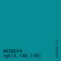Цвет #058C94 в цветовой модели RGB обозначается тремя октетами (5, 140, 148) в десятичном формате и #058C94 в шестнадцатиричном (hex) формате, которые являются интенсивностью красного 5 (hex 05), интенсивность зелёного 140 (hex 8C) и интенсивность синего 148 (hex 94).