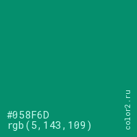 Цвет #058F6D в цветовой модели RGB обозначается тремя октетами (5, 143, 109) в десятичном формате и #058F6D в шестнадцатиричном (hex) формате, которые являются интенсивностью красного 5 (hex 05), интенсивность зелёного 143 (hex 8F) и интенсивность синего 109 (hex 6D).