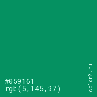 Цвет #059161 в цветовой модели RGB обозначается тремя октетами (5, 145, 97) в десятичном формате и #059161 в шестнадцатиричном (hex) формате, которые являются интенсивностью красного 5 (hex 05), интенсивность зелёного 145 (hex 91) и интенсивность синего 97 (hex 61).