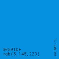 Цвет #0591DF в цветовой модели RGB обозначается тремя октетами (5, 145, 223) в десятичном формате и #0591DF в шестнадцатиричном (hex) формате, которые являются интенсивностью красного 5 (hex 05), интенсивность зелёного 145 (hex 91) и интенсивность синего 223 (hex DF).