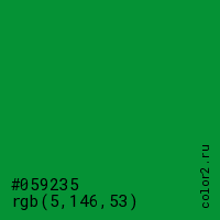 Цвет #059235 в цветовой модели RGB обозначается тремя октетами (5, 146, 53) в десятичном формате и #059235 в шестнадцатиричном (hex) формате, которые являются интенсивностью красного 5 (hex 05), интенсивность зелёного 146 (hex 92) и интенсивность синего 53 (hex 35).