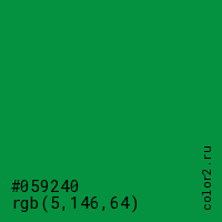 Цвет #059240 в цветовой модели RGB обозначается тремя октетами (5, 146, 64) в десятичном формате и #059240 в шестнадцатиричном (hex) формате, которые являются интенсивностью красного 5 (hex 05), интенсивность зелёного 146 (hex 92) и интенсивность синего 64 (hex 40).