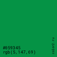 Цвет #059345 в цветовой модели RGB обозначается тремя октетами (5, 147, 69) в десятичном формате и #059345 в шестнадцатиричном (hex) формате, которые являются интенсивностью красного 5 (hex 05), интенсивность зелёного 147 (hex 93) и интенсивность синего 69 (hex 45).