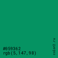 Цвет #059362 в цветовой модели RGB обозначается тремя октетами (5, 147, 98) в десятичном формате и #059362 в шестнадцатиричном (hex) формате, которые являются интенсивностью красного 5 (hex 05), интенсивность зелёного 147 (hex 93) и интенсивность синего 98 (hex 62).