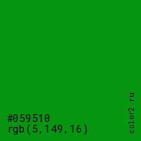 Цвет #059510 в цветовой модели RGB обозначается тремя октетами (5, 149, 16) в десятичном формате и #059510 в шестнадцатиричном (hex) формате, которые являются интенсивностью красного 5 (hex 05), интенсивность зелёного 149 (hex 95) и интенсивность синего 16 (hex 10).