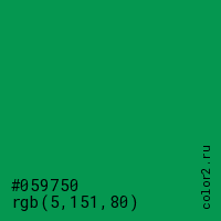Цвет #059750 в цветовой модели RGB обозначается тремя октетами (5, 151, 80) в десятичном формате и #059750 в шестнадцатиричном (hex) формате, которые являются интенсивностью красного 5 (hex 05), интенсивность зелёного 151 (hex 97) и интенсивность синего 80 (hex 50).
