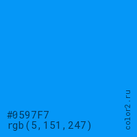 Цвет #0597F7 в цветовой модели RGB обозначается тремя октетами (5, 151, 247) в десятичном формате и #0597F7 в шестнадцатиричном (hex) формате, которые являются интенсивностью красного 5 (hex 05), интенсивность зелёного 151 (hex 97) и интенсивность синего 247 (hex F7).
