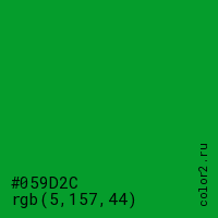 Цвет #059D2C в цветовой модели RGB обозначается тремя октетами (5, 157, 44) в десятичном формате и #059D2C в шестнадцатиричном (hex) формате, которые являются интенсивностью красного 5 (hex 05), интенсивность зелёного 157 (hex 9D) и интенсивность синего 44 (hex 2C).