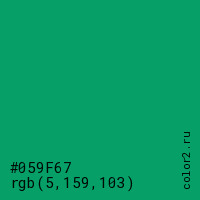 Цвет #059F67 в цветовой модели RGB обозначается тремя октетами (5, 159, 103) в десятичном формате и #059F67 в шестнадцатиричном (hex) формате, которые являются интенсивностью красного 5 (hex 05), интенсивность зелёного 159 (hex 9F) и интенсивность синего 103 (hex 67).
