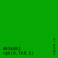 Цвет #05A802 в цветовой модели RGB обозначается тремя октетами (5, 168, 2) в десятичном формате и #05A802 в шестнадцатиричном (hex) формате, которые являются интенсивностью красного 5 (hex 05), интенсивность зелёного 168 (hex A8) и интенсивность синего 2 (hex 02).
