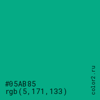 Цвет #05AB85 в цветовой модели RGB обозначается тремя октетами (5, 171, 133) в десятичном формате и #05AB85 в шестнадцатиричном (hex) формате, которые являются интенсивностью красного 5 (hex 05), интенсивность зелёного 171 (hex AB) и интенсивность синего 133 (hex 85).