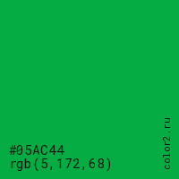 Цвет #05AC44 в цветовой модели RGB обозначается тремя октетами (5, 172, 68) в десятичном формате и #05AC44 в шестнадцатиричном (hex) формате, которые являются интенсивностью красного 5 (hex 05), интенсивность зелёного 172 (hex AC) и интенсивность синего 68 (hex 44).