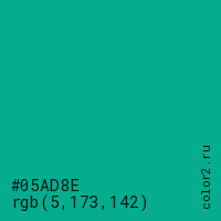 Цвет #05AD8E в цветовой модели RGB обозначается тремя октетами (5, 173, 142) в десятичном формате и #05AD8E в шестнадцатиричном (hex) формате, которые являются интенсивностью красного 5 (hex 05), интенсивность зелёного 173 (hex AD) и интенсивность синего 142 (hex 8E).