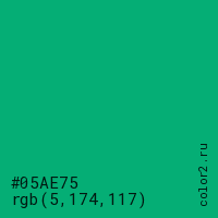 Цвет #05AE75 в цветовой модели RGB обозначается тремя октетами (5, 174, 117) в десятичном формате и #05AE75 в шестнадцатиричном (hex) формате, которые являются интенсивностью красного 5 (hex 05), интенсивность зелёного 174 (hex AE) и интенсивность синего 117 (hex 75).