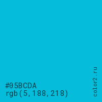 Цвет #05BCDA в цветовой модели RGB обозначается тремя октетами (5, 188, 218) в десятичном формате и #05BCDA в шестнадцатиричном (hex) формате, которые являются интенсивностью красного 5 (hex 05), интенсивность зелёного 188 (hex BC) и интенсивность синего 218 (hex DA).