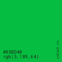 Цвет #05BD40 в цветовой модели RGB обозначается тремя октетами (5, 189, 64) в десятичном формате и #05BD40 в шестнадцатиричном (hex) формате, которые являются интенсивностью красного 5 (hex 05), интенсивность зелёного 189 (hex BD) и интенсивность синего 64 (hex 40).