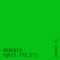 Цвет #05C015 в цветовой модели RGB обозначается тремя октетами (5, 192, 21) в десятичном формате и #05C015 в шестнадцатиричном (hex) формате, которые являются интенсивностью красного 5 (hex 05), интенсивность зелёного 192 (hex C0) и интенсивность синего 21 (hex 15).