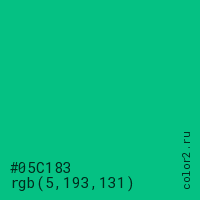Цвет #05C183 в цветовой модели RGB обозначается тремя октетами (5, 193, 131) в десятичном формате и #05C183 в шестнадцатиричном (hex) формате, которые являются интенсивностью красного 5 (hex 05), интенсивность зелёного 193 (hex C1) и интенсивность синего 131 (hex 83).