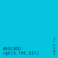 Цвет #05C4DD в цветовой модели RGB обозначается тремя октетами (5, 196, 221) в десятичном формате и #05C4DD в шестнадцатиричном (hex) формате, которые являются интенсивностью красного 5 (hex 05), интенсивность зелёного 196 (hex C4) и интенсивность синего 221 (hex DD).