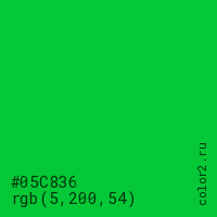 Цвет #05C836 в цветовой модели RGB обозначается тремя октетами (5, 200, 54) в десятичном формате и #05C836 в шестнадцатиричном (hex) формате, которые являются интенсивностью красного 5 (hex 05), интенсивность зелёного 200 (hex C8) и интенсивность синего 54 (hex 36).