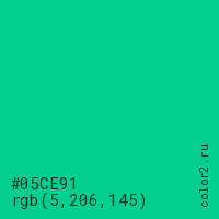 Цвет #05CE91 в цветовой модели RGB обозначается тремя октетами (5, 206, 145) в десятичном формате и #05CE91 в шестнадцатиричном (hex) формате, которые являются интенсивностью красного 5 (hex 05), интенсивность зелёного 206 (hex CE) и интенсивность синего 145 (hex 91).