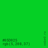 Цвет #05D025 в цветовой модели RGB обозначается тремя октетами (5, 208, 37) в десятичном формате и #05D025 в шестнадцатиричном (hex) формате, которые являются интенсивностью красного 5 (hex 05), интенсивность зелёного 208 (hex D0) и интенсивность синего 37 (hex 25).