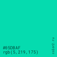 Цвет #05DBAF в цветовой модели RGB обозначается тремя октетами (5, 219, 175) в десятичном формате и #05DBAF в шестнадцатиричном (hex) формате, которые являются интенсивностью красного 5 (hex 05), интенсивность зелёного 219 (hex DB) и интенсивность синего 175 (hex AF).