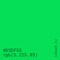 Цвет #05DF55 в цветовой модели RGB обозначается тремя октетами (5, 223, 85) в десятичном формате и #05DF55 в шестнадцатиричном (hex) формате, которые являются интенсивностью красного 5 (hex 05), интенсивность зелёного 223 (hex DF) и интенсивность синего 85 (hex 55).