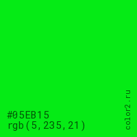 Цвет #05EB15 в цветовой модели RGB обозначается тремя октетами (5, 235, 21) в десятичном формате и #05EB15 в шестнадцатиричном (hex) формате, которые являются интенсивностью красного 5 (hex 05), интенсивность зелёного 235 (hex EB) и интенсивность синего 21 (hex 15).