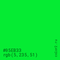 Цвет #05EB33 в цветовой модели RGB обозначается тремя октетами (5, 235, 51) в десятичном формате и #05EB33 в шестнадцатиричном (hex) формате, которые являются интенсивностью красного 5 (hex 05), интенсивность зелёного 235 (hex EB) и интенсивность синего 51 (hex 33).