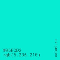 Цвет #05ECD2 в цветовой модели RGB обозначается тремя октетами (5, 236, 210) в десятичном формате и #05ECD2 в шестнадцатиричном (hex) формате, которые являются интенсивностью красного 5 (hex 05), интенсивность зелёного 236 (hex EC) и интенсивность синего 210 (hex D2).