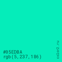 Цвет #05EDBA в цветовой модели RGB обозначается тремя октетами (5, 237, 186) в десятичном формате и #05EDBA в шестнадцатиричном (hex) формате, которые являются интенсивностью красного 5 (hex 05), интенсивность зелёного 237 (hex ED) и интенсивность синего 186 (hex BA).