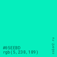 Цвет #05EEBD в цветовой модели RGB обозначается тремя октетами (5, 238, 189) в десятичном формате и #05EEBD в шестнадцатиричном (hex) формате, которые являются интенсивностью красного 5 (hex 05), интенсивность зелёного 238 (hex EE) и интенсивность синего 189 (hex BD).