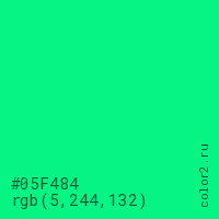 Цвет #05F484 в цветовой модели RGB обозначается тремя октетами (5, 244, 132) в десятичном формате и #05F484 в шестнадцатиричном (hex) формате, которые являются интенсивностью красного 5 (hex 05), интенсивность зелёного 244 (hex F4) и интенсивность синего 132 (hex 84).