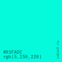 Цвет #05FADC в цветовой модели RGB обозначается тремя октетами (5, 250, 220) в десятичном формате и #05FADC в шестнадцатиричном (hex) формате, которые являются интенсивностью красного 5 (hex 05), интенсивность зелёного 250 (hex FA) и интенсивность синего 220 (hex DC).