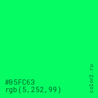 Цвет #05FC63 в цветовой модели RGB обозначается тремя октетами (5, 252, 99) в десятичном формате и #05FC63 в шестнадцатиричном (hex) формате, которые являются интенсивностью красного 5 (hex 05), интенсивность зелёного 252 (hex FC) и интенсивность синего 99 (hex 63).