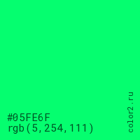 Цвет #05FE6F в цветовой модели RGB обозначается тремя октетами (5, 254, 111) в десятичном формате и #05FE6F в шестнадцатиричном (hex) формате, которые являются интенсивностью красного 5 (hex 05), интенсивность зелёного 254 (hex FE) и интенсивность синего 111 (hex 6F).