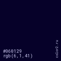 Цвет #060129 в цветовой модели RGB обозначается тремя октетами (6, 1, 41) в десятичном формате и #060129 в шестнадцатиричном (hex) формате, которые являются интенсивностью красного 6 (hex 06), интенсивность зелёного 1 (hex 01) и интенсивность синего 41 (hex 29).