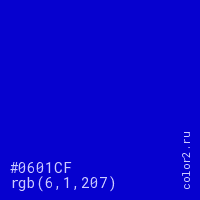 Цвет #0601CF в цветовой модели RGB обозначается тремя октетами (6, 1, 207) в десятичном формате и #0601CF в шестнадцатиричном (hex) формате, которые являются интенсивностью красного 6 (hex 06), интенсивность зелёного 1 (hex 01) и интенсивность синего 207 (hex CF).