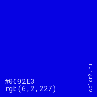 Цвет #0602E3 в цветовой модели RGB обозначается тремя октетами (6, 2, 227) в десятичном формате и #0602E3 в шестнадцатиричном (hex) формате, которые являются интенсивностью красного 6 (hex 06), интенсивность зелёного 2 (hex 02) и интенсивность синего 227 (hex E3).